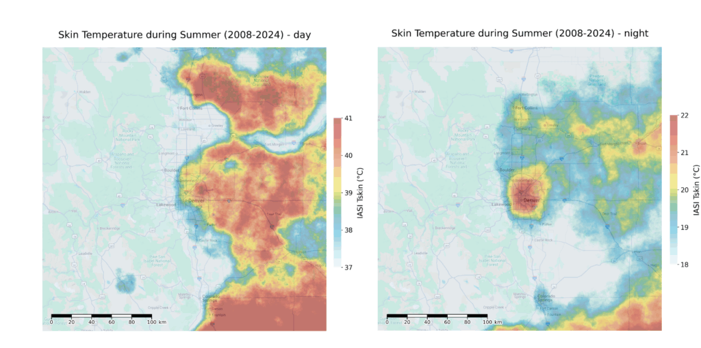 The averaging of Tskin over the IASI period in Summer highlights the presence of an urban heat island in Denver, Colorado